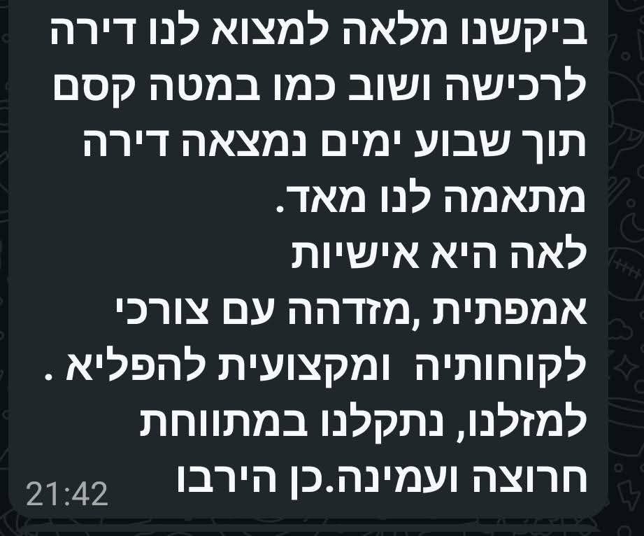 לאה יקרה רצינו להודות לך מכל הלב על הליווי בקניית דירה ושלא התייאשת מאיתנו 😅 ידעת בדיוק מה אנחנו מחפשים, יחד עם אילוצי התקציב וידעת להראות לנו רק את הדירות המתאימות עבורנו. בזכותך הצלחנו למצוא את הדירה המתאימה בשבילנו ובשכונה שרצינו. דאגת לעסקה מהירה וידעת להוביל אותה ולעשות הכל עד לחתימה. בלעדייך זה לא היה קורה.. אז תודה על המקצועיות, השקיפות, על העצות הטובות ועל ההרגשה הטובה שנתת לאורך כל הדרך. אין ספק שאת מספר 🥇 והיינו בוחרים בך שוב ושוב ❤️